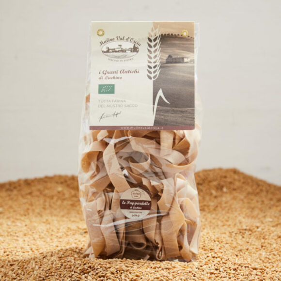 -Wholemeal semolina pasta made from Senatore Cappelli organic durum wheat. We pursue a different Idea of Pasta, milling Integrale the recognized excellence of Senatore Cappelli Durum Wheat; by bronze drawing the result has peculiar, and unique characteristics: undoubted nutritional ones, thanks also to the slow drying process, but more so those of the pleasure it gives in cooking and eating it. Chocolate-colored and uneven-surfaced and therefore porous, tenacious but not stubbornly textured, though good with everything She likes a seasoning that does not overpower her but complements her, a playful contending for the stage of the palate. About 20 hours average drying time at a temperature of about 38°/42°. CYCLING Average distance between the harvesting field and the mill-pastry factory: 6 km. Storage period: 18 months.