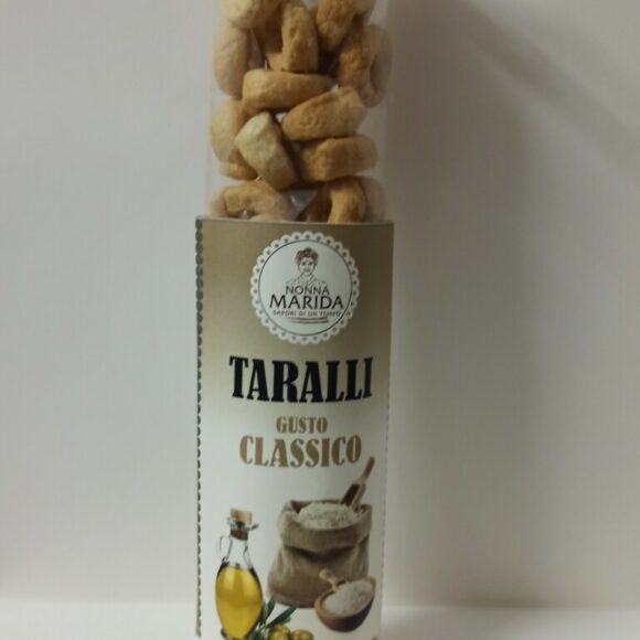 – Explore the Authentic Taste with Our Taralli al Gusto Classico! Our Classic Taste Taralli are an ode to traditional flavor, wrapped in a crunchy texture that will captivate every bite. Satisfy your cravings for a bold and spicy snack with this unique treat. Features of Our Classic Taste Taralli: Authentic Taste: Rediscover the genuine flavor of culinary tradition with each tarallo. Crispy Consistency: Irresistible crunchiness is the signature of each tarallo, making them the perfect choice for a satisfying snack. How to Enjoy Our Classic Taste Taralli: Perfect Aperitif: Serve them during an aperitif to add a touch of authenticity to any gathering. Healthy Snack: Satisfy your craving for crunch with a healthy and tasty option. Ideal Accompaniment: Accompany your favorite dishes with these taralli for a unique twist. Why Choose Our Classic Taste Taralli: High Quality Ingredients: We use only premium ingredients to ensure authentic, wholesome flavor. Unique Versatility: Give your gourmet breaks a distinctive touch with our Classic Flavor Taralli.