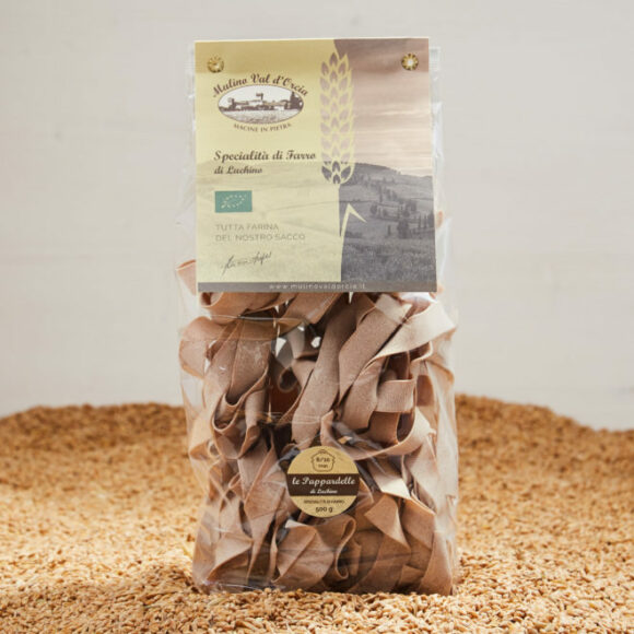 -Organic spelt pasta, stone-ground flour, bronze dies. Produced with stone-ground organic flours in the farm mill, bronze-drawn and dried slowly at low temperature, Mulino Val d’Orcia pasta is an artisanal, extremely porous product with a distinctive amber color and unmistakable flavor! Our pasta made with stone-ground spelt flour has a higher fiber and mineral content than industrial pasta and retains its lipid-vitamin properties, is a more balanced pasta and has a lower glycemic index. About 20 hours of average drying at a temperature of around 38°/42°.