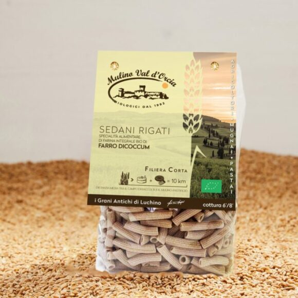 -Organic spelt pasta, stone-ground flour, bronze dies. Produced with stone-ground organic flours in the farm mill, bronze-drawn and dried slowly at low temperature, Mulino Val d’Orcia pasta is an artisanal, extremely porous product with a distinctive amber color and unmistakable flavor! Our pasta made with stone-ground spelt flour has a higher fiber and mineral content than industrial pasta and retains its lipid-vitamin properties, is a more balanced pasta and has a lower glycemic index. About 18 hours of average drying time at a temperature of about 38°/42°.