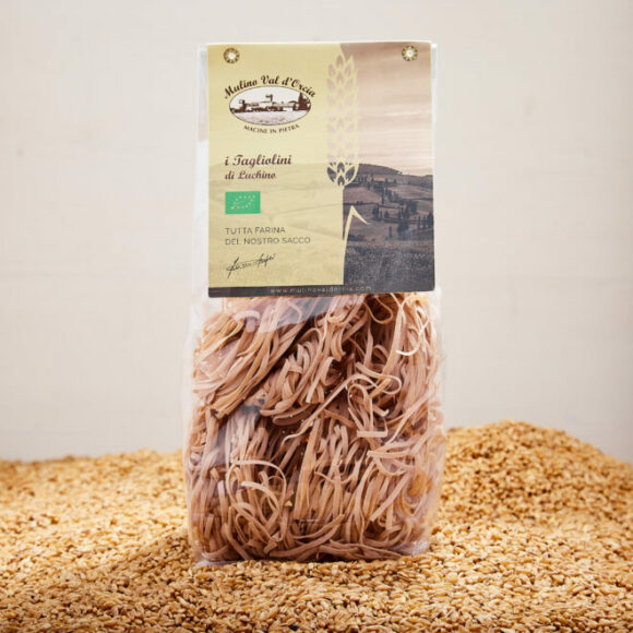 -Organic spelt pasta, stone-ground flour, bronze dies. Produced with stone-ground organic flours in the farm mill, bronze-drawn and dried slowly at low temperature, Mulino Val d’Orcia pasta is an artisanal, extremely porous product with a distinctive amber color and unmistakable flavor! Our pasta made with stone-ground spelt flour has a higher fiber and mineral content than industrial pasta and retains its lipid-vitamin properties, is a more balanced pasta and has a lower glycemic index. About 20 hours of average drying at a temperature of around 38°/42°. WEIGHT: 400 g.