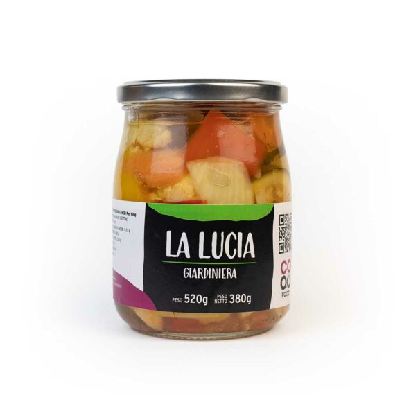 – “La Lucia” Giardiniera is an explosion of colors and flavors that brings to the table the freshness and authenticity of seasonal vegetables. An artisanal product made with care and passion, according to tradition, to offer you a versatile condiment with a unique taste. -No preservatives: Giardiniera “La Lucia” is a healthy and natural product, free of preservatives and artificial coloring. Flavor: A perfect balance between sweet and sour taste, perfect cooking that brings out the flavor and crunchiness of the vegetables. Color: A riot of bright colors that makes giardiniera a decorative element for your dishes. Usage: Perfect to accompany main courses of meat, fish or cheese, but also to enrich salads, sandwiches and pizzas. Storage: Store in a cool, dry place. After opening, store in the refrigerator at +4°C and consume within a few days. Tips: For a complete second course, serve giardiniera with grilled meat or baked fish. Add giardiniera to a simple vegetable salad for an extra touch of flavor. Use giardiniera to enrich a margherita pizza or focaccia. Net weight: 390g. Weight: 0.520kg.