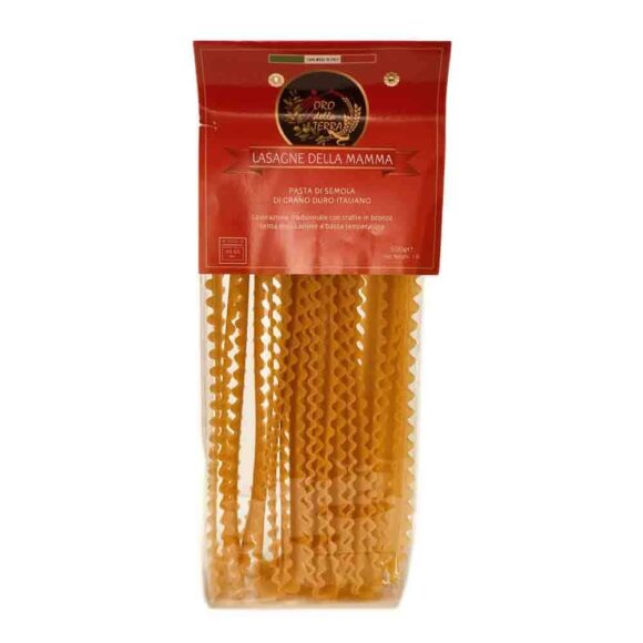-Lasagne curly “mom’s Lasagna.” 500 g package. 100% Italian durum wheat semolina pasta. Bronze-drawn and slow-dried at low temperature, artisanal Italian pasta. Curly lasagna is perfect for making a rich baked pasta dish excellent with either a meat or vegetable ragout, try it stuffed with scamorza cheese and zucchini in the rolled version and arranged like roses in the oven dish!