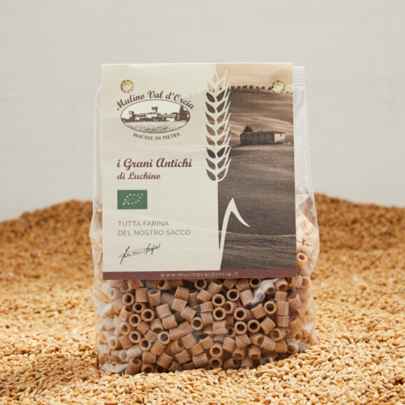 -Wholemeal semolina pasta made from Senatore Cappelli organic durum wheat. We pursue a different Idea of Pasta, milling Integrale the recognized excellence of Senatore Cappelli Durum Wheat; by bronze drawing the result has peculiar, and unique characteristics: undoubted nutritional ones, thanks also to the slow drying process, but more so those of the pleasure it gives in cooking and eating it. Chocolate-colored and uneven-surfaced and therefore porous, tenacious but not stubbornly textured, though good with everything She likes a seasoning that does not overpower her but complements her, a playful contending for the stage of the palate. CYCLING Average distance between the harvesting field and the mill-drying facility: 6 km. About 18 hours of average drying time at a temperature of about 38°/42°.