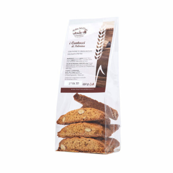 -Cantucci are a traditional recipe made with our stone-ground flours from the grains we grow in the Val d’Orcia. 150 g package.