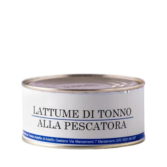 Denominazione: THUNNUS ALLETTERATUS Ingredienti: lattume 62%, salsa di pomodoro, olio d’oliva, olive, capperi, sale. Peso netto: 300 g – sgocc. 220 g Conservazione: 4 anni dalla data di produzione; dopo l’apertura conservare in frigo e consumare entro 3 giorni. Stabilimento di produzione: Adelfio Francesco – Via marzamemi 7 – 96018 – Marzamemi (SR).