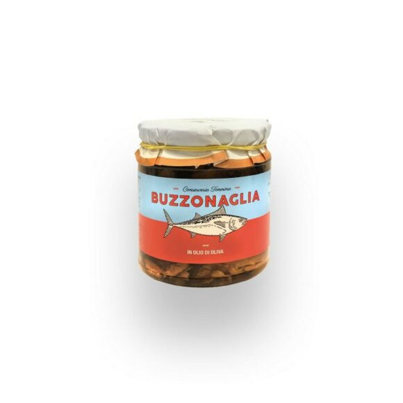 -La buzzonaglia è una particolare conserva del tonno che fa uso del taglio meno pregiato del pesce, confezionato sott’olio. Ottima per un sugo con aggiunta di pomodorini. -Ingredienti: Tonno 65%, (Thunnus Thynnus – Zona FAO 37.1.3 – pescato con reti da circuizione e raccolta), olio di semi di girasole, sale.