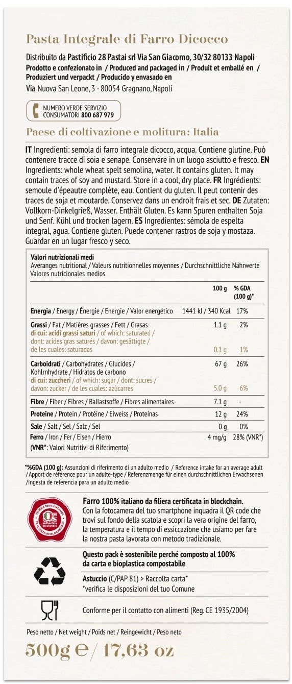 Le Casareccia integrale è un formato di pasta corto perfetto per la sua forma per trattenere sughi e condimenti. In particolare, nella sua versione integrale, è consigliato combinarle con verdure e preparazioni orientali con salsa di soia, pesce e sughi di carni bianche. Il farro vanta origini lontane nella storia. In particolare, il Farro Dicocco (Triticum dicoccum), che abbiamo selezionato con cura e passione, veniva coltivato già nel VI millenio a.C. in Egitto e fu successivamente importato in Italia, proprio su queste colline, dove veniva coltivato dagli Antichi Romani. Ancora oggi, come allora, il nostro farro dicocco è decorticato e molito a pietra per preservarne sapore e qualità nutritive. Il farro ha infatti un gusto unico, diverso da qualsiasi altra pasta abbiate già assaggiato, gradevole al palato e profondo al naso, grazie ai suoi inconfondibili sentori di nocciola che lo rendono un’alternativa salutare e gustosissima con cui sperimentare nuove ricette che valorizzano materie prime autentiche e dal gusto puro. Una pasta che fa bene anche alla salute grazie alle sue moltissime proprietà benefiche: alto contenuto di proteine, fonte di fibre digeribili, aminoacidi essenziali, vitamine (vitamina A, tiamina B1, riboflavina B2 e niacina B3) e minerali, come ferro, fosforo, potassio. Una pasta, ovviamente, anche molto digeribile, considerato il suo indice glicemico migliore rispetto al grano duro e un valore bilanciato di proteine e un basso di grassi e calorie.