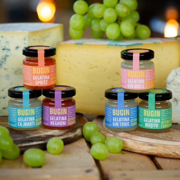 Sorprendi il tavolo dei tuoi ospiti con i primi drink in gelatina: la rivoluzione degli abbinamenti con i formaggi!Le gelatine al gusto dei cocktail sono prodotte da BUGIN nel proprio laboratorio a pochi passi da Torino, con l’obiettivo di esaltare i formaggi in modo davvero inedito. Sei sapori distinti, pensati per i diversi tipi di formaggio. Ogni gelatina prodotta da BUGIN è un’esperienza da gustare, con i sapori dei cocktail più amati: