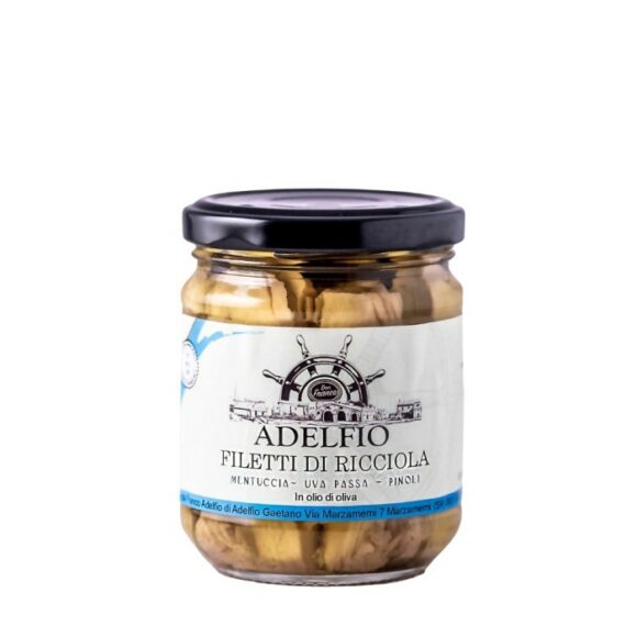 La Ricciola sottolio con mentuccia, uva passa e pinoli è  una conserva che si presenta dal gusto delicato, da proporre come contorno abbinata ad una insalata verde e spezie di vostro gradimento. Ideale anche per condire primi piatti. I Filetti di Ricciola con mentuccia, uva passa e pinoli in vaso Adelfio sono una prelibatezza che incarna la tradizione gastronomica siciliana, dove il mare e la terra si incontrano in un equilibrio perfetto di sapori. Questo prodotto gourmet offre filetti di ricciola, un pesce dalla carne morbida e saporita, arricchiti con un mix di ingredienti aromatici e dolci, come la mentuccia, l’uva passa e i pinoli. La mentuccia, con il suo aroma fresco e leggermente pepato, conferisce un tocco di vivacità, mentre l’uva passa apporta una dolcezza naturale che bilancia splendidamente il sapore delicato della ricciola. I pinoli, con il loro gusto tostato e leggermente burroso, completano l’insieme, aggiungendo una croccantezza che rende ogni boccone un’esperienza sensoriale unica. Il prodotto è confezionato in un vaso da 200 gr, ideale per essere servito come antipasto raffinato o come piatto principale, perfetto per accompagnare insalate, bruschette o piatti di pasta. L’alta qualità della ricciola, unita alla scelta di ingredienti freschi e genuini, rende questo prodotto una vera delizia per chi cerca sapori autentici e delicati, ma ricchi di personalità. Adelfio, con la sua attenzione ai dettagli, garantisce un prodotto di altissima qualità che porta in tavola l’essenza del Mediterraneo.