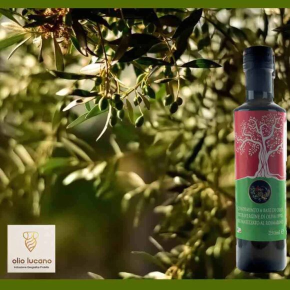 -Olio EVO al rosmarino. Condimento a base di olio extravergine di oliva (99%) aromatizzato al rosmarino, perfetto per le grigliate! Olio lucano I.G.P. Bottiglia da 250 ml. Gli oli aromatizzati dell’Azienda Agricola Saluzzi sono prodotti con olio extravergine di oliva di eccezionale qualità, un’azienda di famiglia tramandata di padre in figlio, ecco come nasce l’Olio EVO al rosmarino. Olivicoltori di tradizione che portano avanti metodi tradizionali e naturali di lavorazione per ottenere prodotti con un alto profilo organolettico, le olive vengono infatti frante con macine in pietra per preservarne tutte le caratteristiche organolettiche e le sostanze preziose dalle indiscusse proprietà benefiche per la nostra salute, quali polifenoli, acidi grassi monoinsaturi e vitamina E. L’olio extra vergine di Oliva al rosmarino ha come caratteristica un olio già di per sé aromatico al quale si è pensato di aggiungere vari aromi naturali selezionati dal proprio territorio. Siamo nelle colline incontaminate della Basilicata ricche di essenze e di erbe, il tutto contribuisce a renderlo un condimento ancor più speciale e versatile perfetto per dare quel tocco inconfondibile alle tue ricette. L’olio aromatizzato classico che si accompagna bene con le carni alla griglia, con le patate arrosto, l’agnello e le verdure.