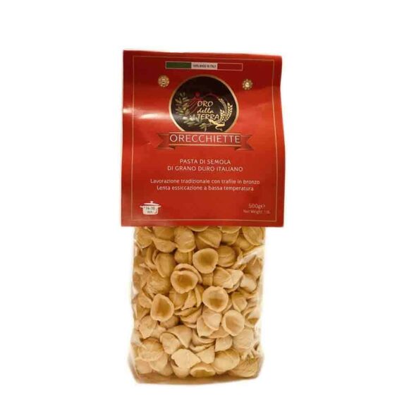–Tempo di preparazione: Due giorni. Ingredienti in etichetta: Semola di GRANO duro, acqua. Allergeni: Grano. Valori nutrizionali medi per 100 g: Energia 1440 kJ/340 kcal, Grassi 0,73 g di cui acidi grassi saturi 0,10 g, Carboidrati 71,70 g di cui zuccheri 2,4 g, Fibre 1,9 g, Proteine 12,92 g, Sale < 0,1 g. Cottura: 14-16 minuti. Modalità di conservazione: Conservare in luogo fresco e asciutto al riparo dai raggi solari. Abbinamenti consigliati: Protagoniste della tradizione lucana, le orecchiette non possono mancare per un primo piatto con verdure di stagione e un buon formaggio di buona sapidità, stagionato. Regione: Basilicata.