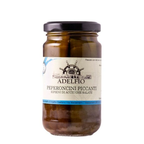 Ingredienti: Peperoncini, acciughe, olio d’oliva, olio di semi di girasole, sale. Peso netto: 200 g  Peso sgocciolato: 130 g Conservazione: 18 mesi dalla data di produzione; dopo l’apertura conservare in frigo e consumare entro 3 giorni. Stabilimento di produzione: Adelfio Francesco – Via marzamemi 7 – 96018 – Marzamemi (SR).