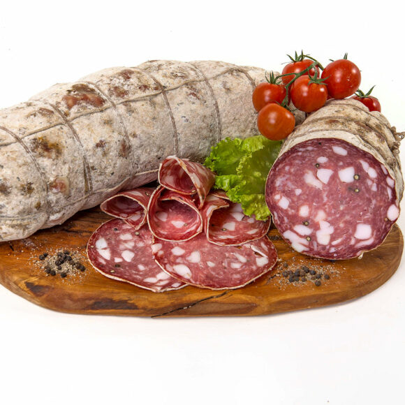 In questo salamino classico “Toscano” la parte magra ricavata dalla rifilatura della spalle e del prosciutto si sposa con i cubetti di grasso di gola che gli conferiscono il particolare taglio della fetta.