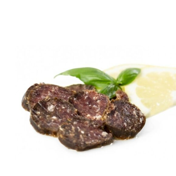Il salamino di tonno Adelfio è una specialità artigianale unica, preparata con carne di tonno speziata e stagionata per offrire un sapore intenso e autentico. Si serve a fette sottilissime, condite con olio d’oliva e succo di limone, da abbinare a un calice di prosecco per un antipasto originale. Viene realizzato con la carne del tonno tagliuzzata finemente e condita con sale e pepe nero, per poi essere insaccato ed essiccato. Disponibile nel formato da 100 gr, accuratamente confezionato in busta sottovuoto.