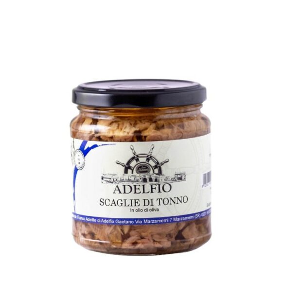 Le scaglie di tonno in olio d’oliva in vaso Adelfio (300 gr) sono un prodotto artigianale ottenuto dalle parti più pregiate del tonno lavorate a mano e conservate in olio d’oliva di alta qualità. Invasettiamo le briciole del tonno in lavorazione con peperoncino rosso e olio d’oliva, creando una prelibatezza versatile, perfetta per arricchire insalate, primi piatti, bruschette o per essere gustate come antipasto. Confezionate in vaso da 300 gr.