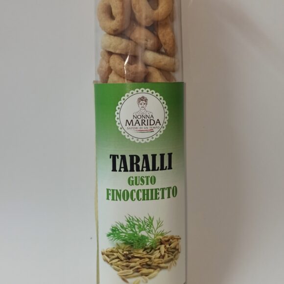 – Esplora la Freschezza con i Taralli al Gusto Finocchietto! Deliziosi e aromatici, i nostri Taralli al Gusto Finocchietto sono un omaggio alla semplicità e all’autenticità della cucina italiana, catturando la freschezza dei campi e la tradizione culinaria mediterranea in ogni morso. Caratteristiche dei Nostri Taralli al Gusto Finocchietto: Aromi del Mediterraneo: Il finocchietto selvatico aggiunge un tocco di aromaticità, portando i profumi dei campi direttamente sulla tua tavola. Croccantezza Unica: Ogni tarallo è lavorato per raggiungere la massima croccantezza, offrendo una sensazione di leggerezza e piacere in ogni morso. Modi Creativi per Godere dei Nostri Taralli: Picnic in Stile Italiano: Porta i Taralli al Gusto Finocchietto al tuo picnic per un’esperienza all’aria aperta con sapori mediterranei. Antipasto Aromatico: Aggiungi i taralli al tuo antipasto per esaltare i sapori e aprire il tuo pasto con gusto. Regalo Gustoso: Crea una confezione regalo con i Taralli al Gusto Finocchietto per regalare autenticità e amore per la cucina italiana. Perché Scegliere i Nostri Taralli al Gusto Finocchietto: Rispetto delle Tradizioni: Unisce la tradizione italiana all’innovazione per una gustosa esperienza culinaria. Ingredienti di Qualità: Utilizziamo finocchietto selvatico di alta qualità per garantire autenticità e freschezza.