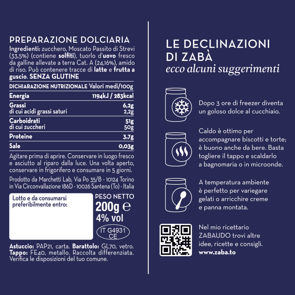 Quando Zabà incontra il Moscato Passito più antico del Piemonte, il giallo si impreziosisce di riflessi ambrati e racconta di una testarda tradizione. Il Passrì profuma delle migliori uve del vigneto Scrapona, prima selezionate e raccolte a mano, poi appassite e vinificate secondo lo storico metodo di Strevi. Si parte sempre dalla stessa idea di buono: uova fresche da galline allevate a terra, zucchero italiano al 100% e ricetta della tradizione.